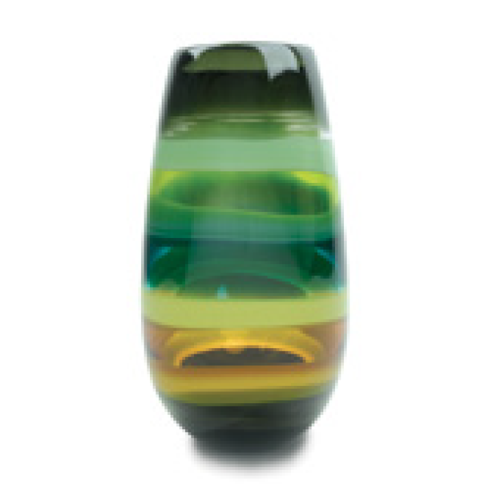 Inspired by the rich hues and topography of Southern California, alternating layers of opaque and transparent colors are applied to clear glass. New colors are formed by overlaps, adding depth to the pieces. Simple shapes complement intense colors. Hand blown and shaped in lead free crystal. Designed by Caleb Siemon. Made in California. Signed.